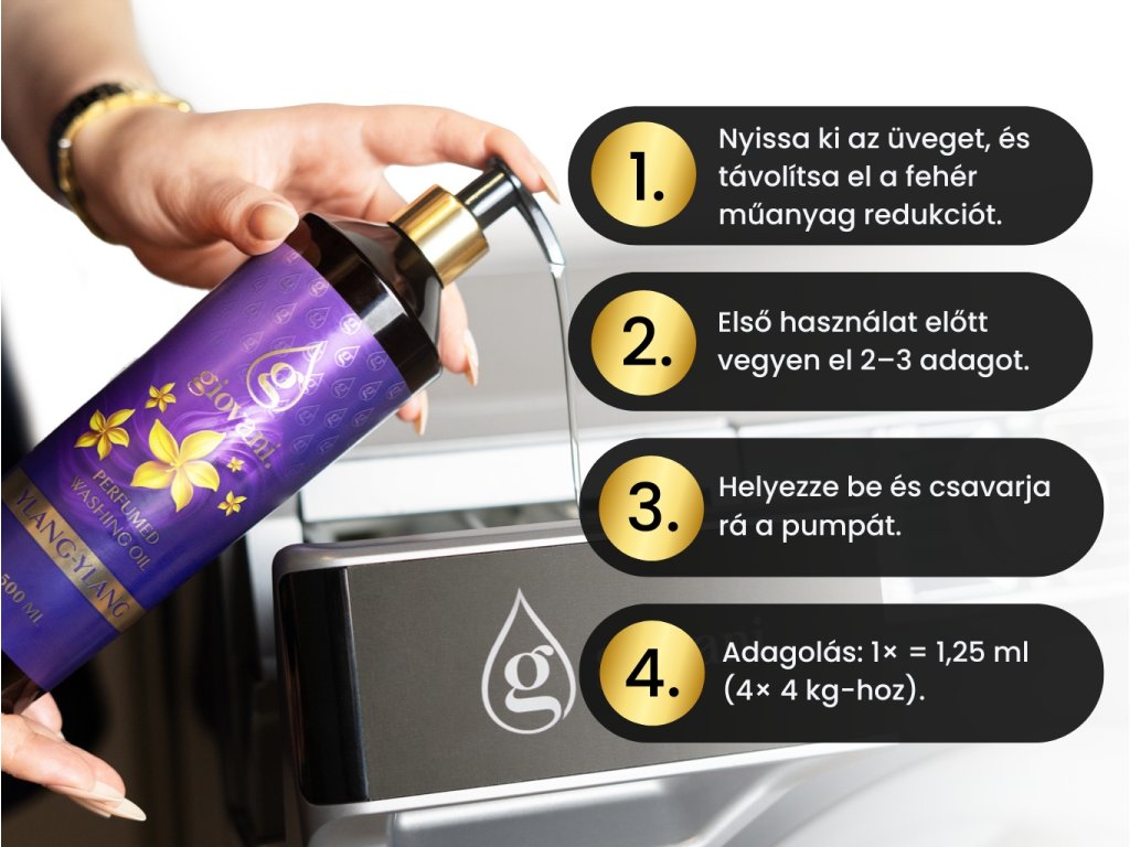 - Alternatív módszer - ha megvásárolja ezt az applikátort, akkor a Giovani® mosóparfümöket a flakonból is adagolhatja egy pumpa segítségével, amelyet ideiglenesen vagy tartósan a flakonra rögzíthet.