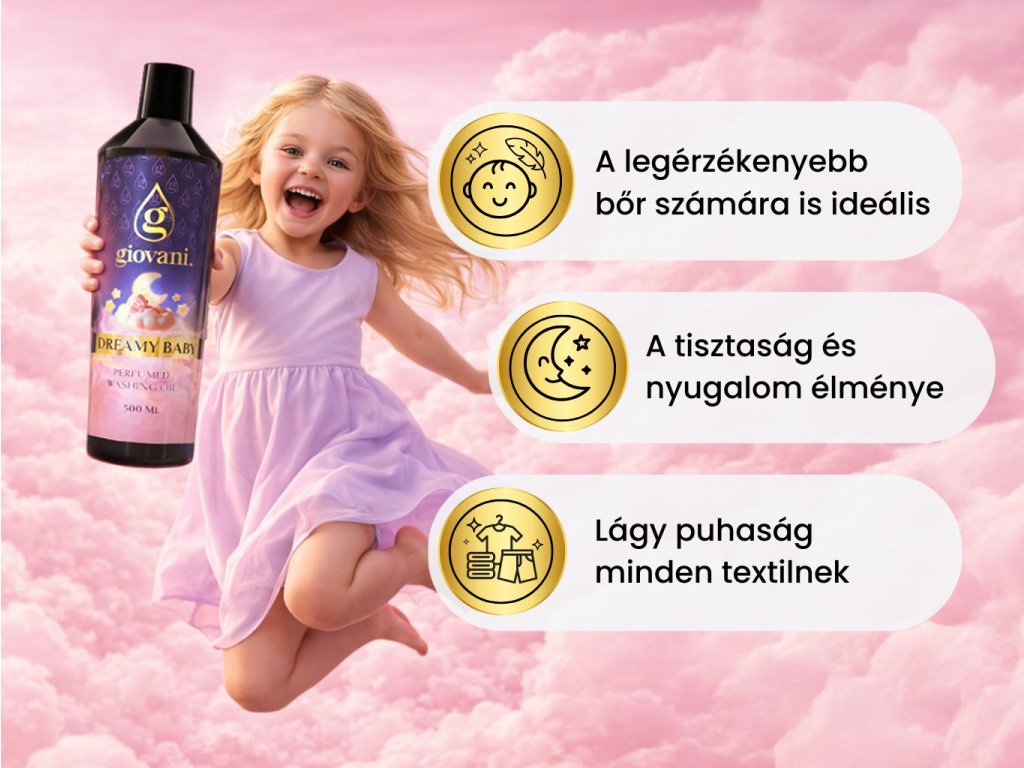A Giovani® DREAMY BABY mosóparfüm illatesszenciái virágos-púderes jegyeket hordoznak, egy csipetnyi frissességgel. A frissítő zöld jegyek és a bergamott nyitják meg az utat az illat finom szívéhez, ahol találkozik a narancsvirág, rózsa, jázmin, ibolya és perui heliotrop. Az alapot bársonyos mósusz, krémes vanília és meleg szantál alkotja. Ez a harmonikus kompozíció elbűvöli az érzékeket, ugyanakkor kíméletes még a legérzékenyebb bőrhöz is..