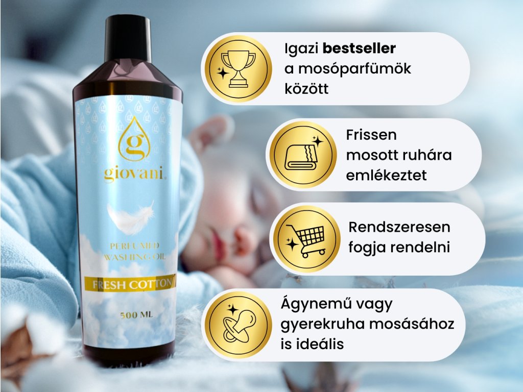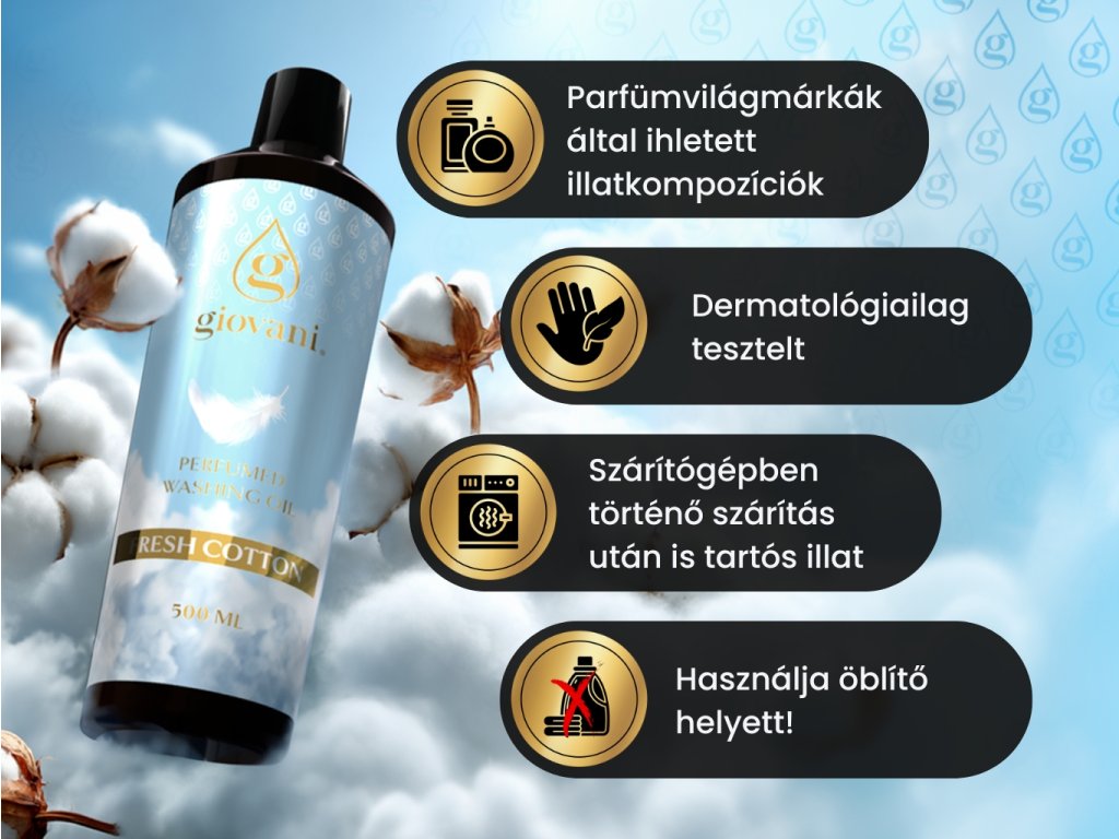 A Giovani® Fresh Cotton mosóolaj illatesszenciái sajátos karakterrel rendelkeznek. Az édes-friss gyöngyvirág a tavasz érzését hozza el otthonába. Az ibolya tiszta és friss illatot kölcsönöz a ruháinak. Az elegáns jázmin a rózsával együtt luxusos és kifinomult érintéssel varázsolja el Önt. Az illat szíve meleg tonkababbal és édes marcipánnal gazdagodik. A krémes vanília, a pézsma és az egzotikus labdanum teszi teljessé az illatot.