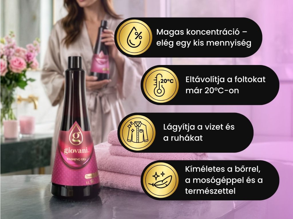 A mosás többé nem csupán kötelesség. A Giovani® SWEET mosógéllel a mosás frissítő élménnyé válik. Ez a magas koncentrációjú mosógél már alacsony adagolás és hőmérséklet mellett is tökéletesen tisztítja ruháit.
