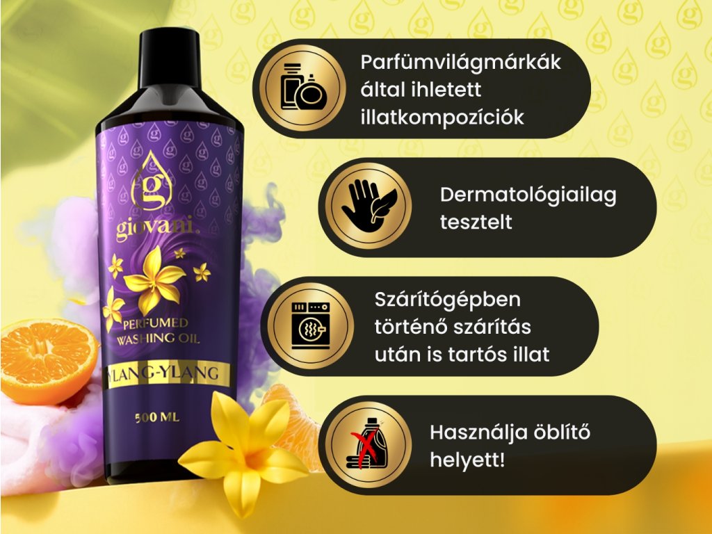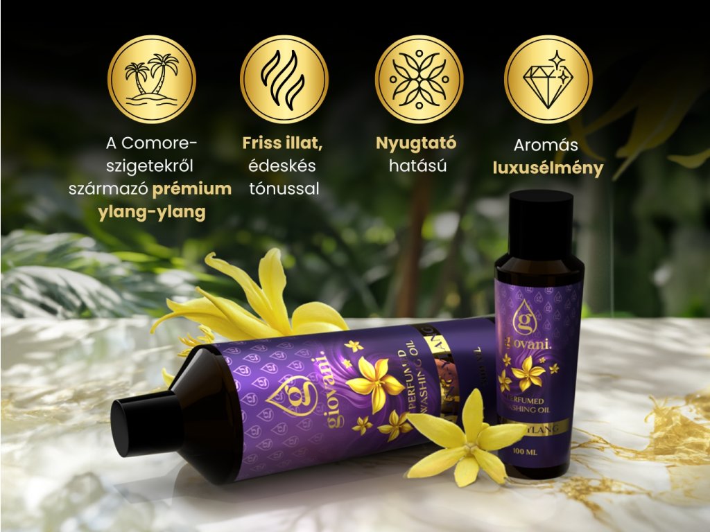 A Giovani® YLANG-YLANG mosóparfüm fő illatkompozíciója a Comore-szigetekről származik, melyek világszerte híresek a legkiválóbb minőségű ylang-ylangról. Az aromaterápiában a stressz, a szorongás enyhítésére és a pihentető alvás támogatására használják.